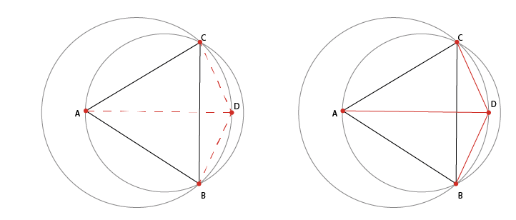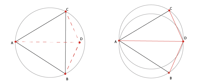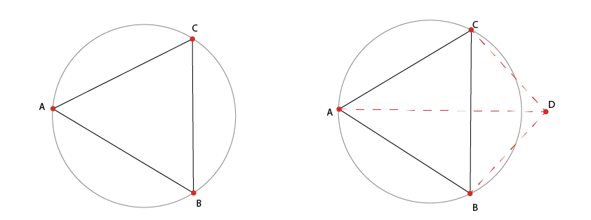 Il triangolo ABC viene inscritto all’interno di un circumcerchio, se poniamo il vertice D esternamente alla circonferenza collegando ulteriormente i vertici per aggiungere il triangolo CBD, la rete risultante apparirà ottimale dal punto di vista del criterio di Delaunay.